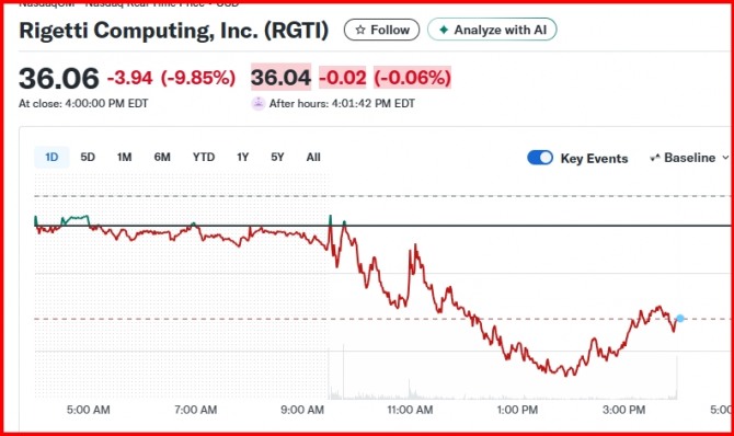 이미지 확대보기구글이 "검증 가능 '양자 우위'알고리즘을 세계 최초 개발했다는 보도가 나온 가운데 그동안 뉴욕증시 상승을 주도해왔던 양자컴 관련 종목들이 와르르 급락해 주목을 끌고 있다. 아이온큐 리게티 디웨이브 퀀텀등이 추락하고 있다. 뉴욕증시 대형펀드들이 아이온큐 리케티 퀀텀 구리고 디웨이브에 대한 투자를 꺼리고 대신 빅테크 쪽으로 이동하고잇다는 분석에 따른 주가 변동이라고 야후 파이낸스는 분석하고있다. 빅테크 기업들이 양자컴에 본격적으로 뛰어들면서 양자컴의 주도권이 구글과 IBM등 빅테크 쪽으로 넘어갈 것이라는 우려가 제기되면서 아이온큐 리게티 디웨이브 등이 흔들리고 있다.