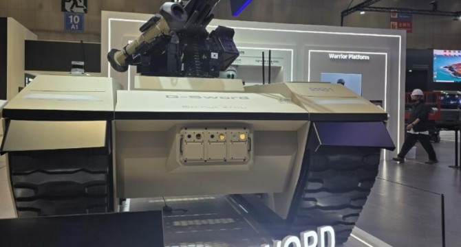 LIG넥스원이 전시회에서 공개한 G-소드는 궤도형 무인지상플랫폼으로, 터렛 장착형 기관포와 한국산 레이볼트(현궁) 대전차유도미사일을 동시에 운용할 수 있는 복합 화력체계를 특징으로 한다. 레이볼트는 LIG넥스원이 개발한 3세대 대전차미사일로, 적외선 영상 추적장치를 활용한 '발사 후 망각(fire-and-forget)' 기능과 반응장갑을 무력화하는 탠덤 탄두를 갖추고 있으며, 최대 사거리 2500m에서 900㎜ 이상의 관통력을 발휘한다.