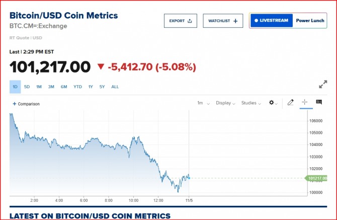 그러나 비트코인 가치는 후퇴하기 시작했다. 뉴욕증시의 3대 주가지수는 위험 회피 분위기가 조성되면서 일제히 하락이다. 장 마감 이후 실적을 발표한 팔란티어 주가가 하락하면서 인공지능(AI) 주식 전반의 분위기가 가라앉았다.
