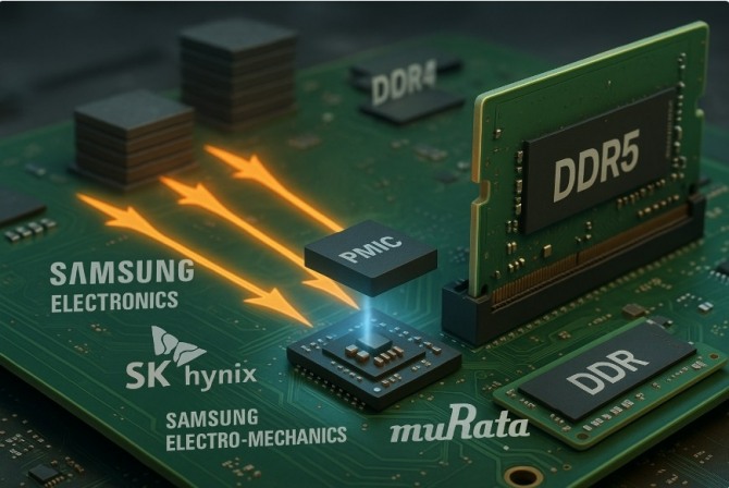 이미지 확대보기DDR5 전환의 핵심은 단순히 속도 향상에 그치지 않는다. 전력 관리 IC(PMIC)가 마더보드에서 메모리 모듈로 직접 이동하는 설계 혁신이 동반된다. 이 작은 변화가 모듈당 수동 부품의 수량과 가치를 동시에 끌어올리며, 삼성전기를 비롯한 글로벌 부품사들의 '조용한 전쟁'을 예고하고 있다.