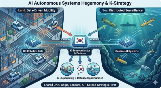 이미지 확대보기이는 경제, 군사, 외교가 하나의 AI 생태계로 묶이는 거대한 변화의 흐름이다. 본지는 외신과 최신 기술 트렌드를 종합 분석하여, 로보택시와 해양전이라는 이질적인 두 분야가 어떻게 'AI 반도체'와 '데이터'라는 공통 분모로 연결되며, 이 지점에서 한국 경제가 맞이할 전략적 기회는 무엇인지 심층 진단한다.