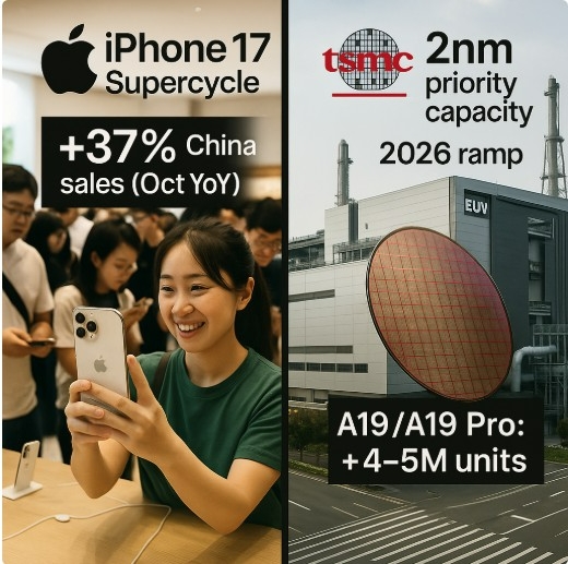 이미지 확대보기애플이 2025년 하반기 승부수로 던진 '아이폰17' 시리즈가 글로벌 시장, 특히 중국에서 '기현상'에 가까운 흥행 돌풍을 일으키고 있다. 중국 내 거센 '애국 소비(Guochao·국조)' 열풍마저 뚫고 판매량이 폭발하자, 애플은 핵심 두뇌인 모바일 AP 'A19' 시리즈의 생산 주문을 전격 확대했다. 애플의 파트너인 대만 TSMC는 라인을 풀가동하며 긴급 대응에 나섰다. 이번 증산은 단순한 물량 확대를 넘어, 향후 2나노 미세공정 경쟁에서 '애플-TSMC' 동맹의 독주 체제를 굳히는 신호탄으로 해석된다.