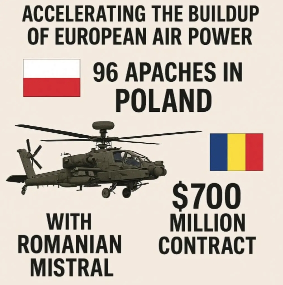 이미지 확대보기tvp월드와 에어로타임, 더디펜스포스트, 로이터통신이 27일(현지시간) 보도한 내용에 따르면, 폴란드는 보잉과 47억 달러(약 6조 8700억 원) 규모로 AH-64E 아파치 헬기 96대 계약을 확정했고, 루마니아는 6억 2500만 유로(약 1조 원) 규모로 프랑스 미스트랄 방공체계를 도입한다고 밝혔다.