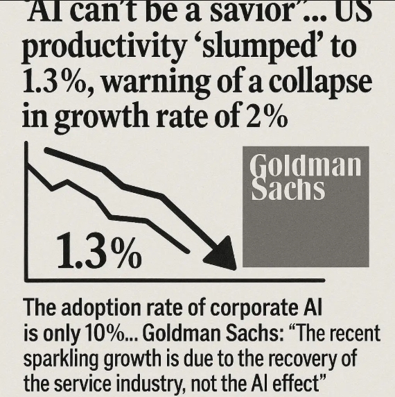 이 매체는 기술 혁신의 역사를 되짚으며 AI 혜택을 체감하기까지 시장 기대보다 훨씬 오랜 시간이 필요하고, 향후 10년간 생산성 증가율이 1.3% 수준으로 떨어지며 미국 경제 성장률이 2%를 밑돌 수 있어 인플레이션 압력과 경기 침체 위험을 높일 것이라고 경고했다.
