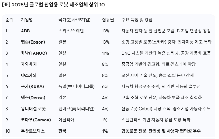 韓 두산로보틱스, 글로벌 산업용 로봇 점유율 10위 진입…ABB·엡손 양강 구도