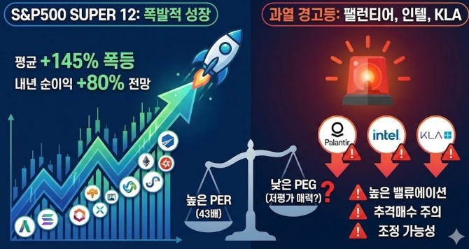 주가가 급등하면서 밸류에이션 부담도 커졌다. 이들 12개 종목의 12개월 선행 주가수익비율(PER)은 평균 43배로, 1년 전 33배에서 크게 높아졌다. S&P500 전체의 PER가 약 22배인 점을 고려하면 시장 평균보다 두 배 가까이 비싼 가격에 거래되고 있는 셈이다.