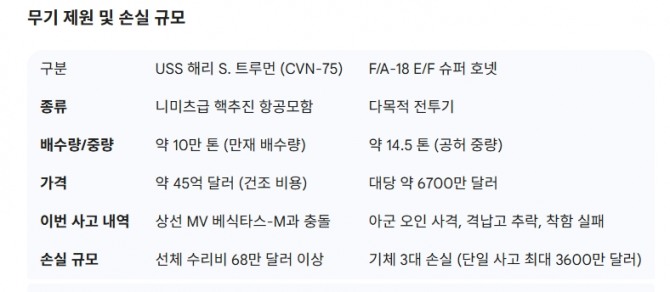 이미지 확대보기군사 전문 매체 조나 밀리타르(Zona Militar)는 5일(현지시각), 미 해군이 최근 공개한 조사 보고서를 인용해 USS 해리 S. 트루먼 항모타격단이 홍해 배치 기간 중 겪은 일련의 사고가 승무원 훈련 부족과 장비 성능 결함에서 비롯됐다고 보도했다. 이로 인해 F/A-18 슈퍼 호넷 전투기 3대가 손실되고 함장 데이브 스노든 대령이 지휘권 박탈을 당하는 등 미 해군 전력 운용의 허점이 적나라하게 드러났다.