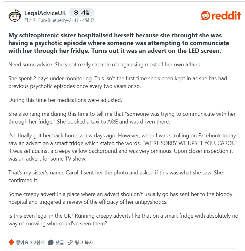 영국 레딧 법률자문 게시판(r/LegalAdviceUK)에 게재된 글에 따르면 캐럴이라는 이름의 조현병 환자가 삼성 패밀리허브 냉장고 화면에 표시된 "우리가 당신을 화나게 해서 미안해, 캐럴(We're sorry we upset you, Carol)"이라는 문구를 보고 누군가 냉장고를 통해 자신과 소통하려 한다고 믿었다.