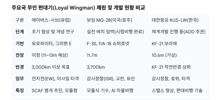주요국 ‘충성 윙맨(Loyal Wingman)’ 개발 현황 비교전 세계적으로 6세대 전투기 개발과 함께 이를 보조할 무인 전투기(CCA) 개발 경쟁이 치열하다.
