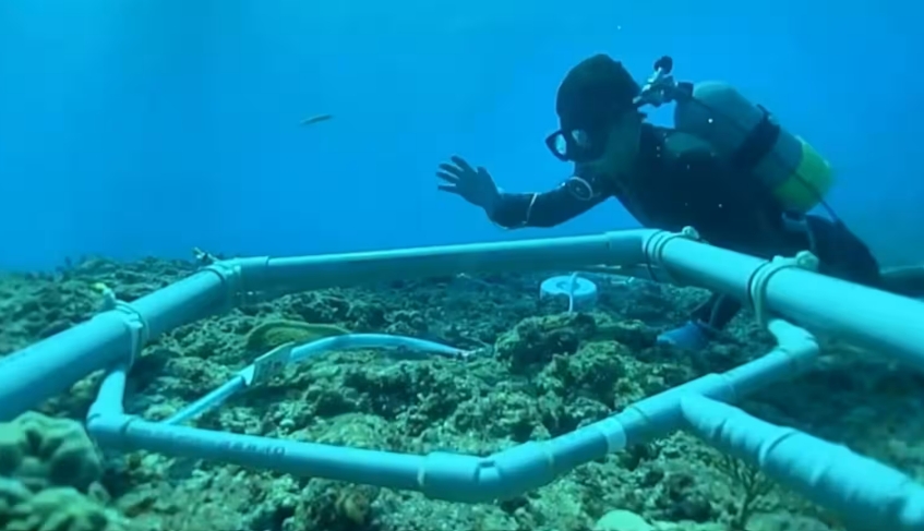 잠수부가 파나소닉, 규슈 공과대학 등에서 개발한 수중 통신 시스템을 테스트하는 작업을 하고 있다. 사진=파나소닉