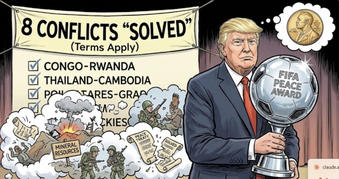 트럼프는 지난 1월 재임 이후 8개 분쟁을 해결했다고 주장한다. △가자지구 이스라엘-하마스 전쟁 △아르메니아-아제르바이잔 분쟁 △세르비아-코소보 긴장 △이집트-에티오피아 긴장 △인도-파키스탄 군사 대치 △태국-캄보디아 국경 충돌 △이스라엘-이란 충돌 △콩고민주공화국-르완다 평화협정 등이다.