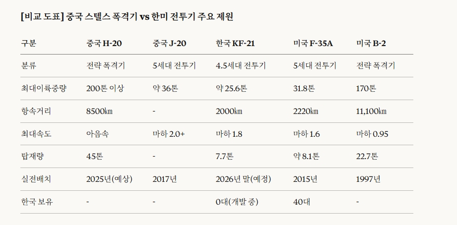 중국의 스텔스 폭격기 배치는 한국 공군과 방위산업에 직접적 영향을 미칠 것으로 분석된다. 중국이 J-20 300대 이상을 운용하는 데 반해 한국은 F-35A 40대를 보유했을 뿐 완전한 5세대 스텔스 전투기 전력이 부족한 상황이다. 국방 전문가들은 2026년 말 전력화 예정인 KF-21 보라매의 조기 배치와 함께 천궁Ⅱ 등 고고도 방공망 확충이 시급하다고 지적한다. KF-21은 4.5세대 전투기로 분류되지만, 최고속도 마하 1.8, 항속거리 2000㎞, 무장 탑재량 7.7톤의 제원을 갖추고 있다. 한편 정부는 내부 무장창을 갖춘 완전한 스텔스 성능의 KF-21EX 개발에 636억 원을 투입하고 항공엔진 국산화에 3조 원 이상을 투자하는 등 공군력 현대화를 가속화하고 있다.