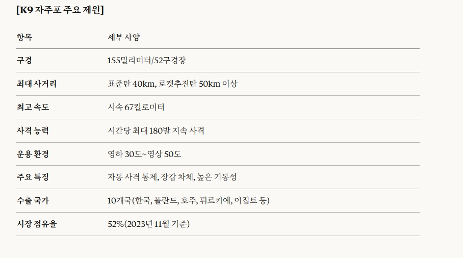 글로벌 시장조사업체 스페리컬 인사이트는 자주포를 포함한 세계 곡사포 시장 규모가 2023년 330억 달러(약 48조6500억 원)에서 2033년 788억 달러(약 116조1900억 원)로 성장할 것으로 전망했다. 이 업체는 곡사포 핵심 제조사 목록에서 K9을 생산하는 한화에어로스페이스를 가장 먼저 언급했다.