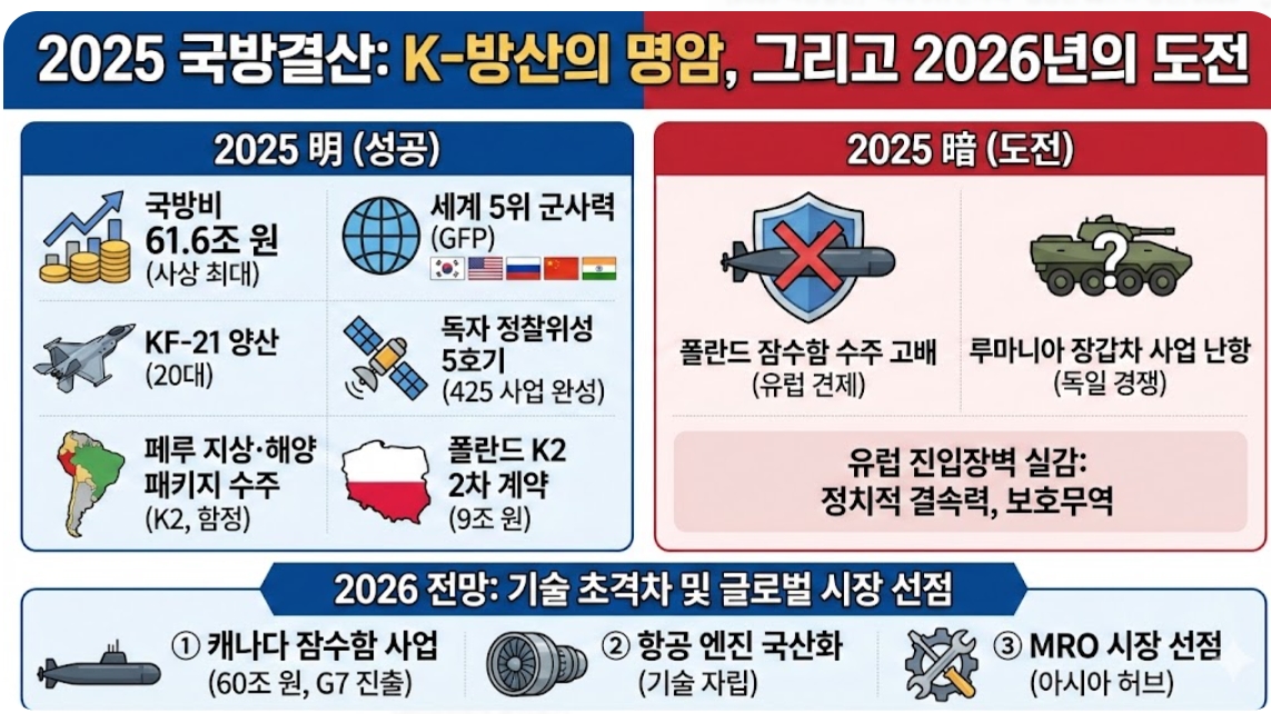 이미지 확대보기방위산업 분야에서는 남미 페루에서 육·해군 통합 수주라는 '대박'을 터뜨리며 수출 영토를 넓혔으나, 유럽 본토의 보이지 않는 진입장벽을 실감하며 폴란드 잠수함 사업에서 쓴잔을 마시는 등 '명(明)과 암(暗)'이 뚜렷하게 교차했다. 특히 루마니아 장갑차 사업 등에서 드러난 유럽의 견제는 2026년 K-방산이 풀어야 할 핵심 과제로 남았다.