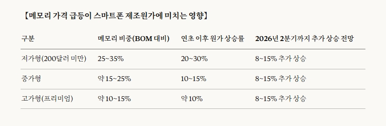 카운터포인트는 메모리 가격이 내년 2분기까지 최대 40% 추가 상승할 수 있다고 분석했다. 이미 높아진 제조원가도 현재보다 8%에서 15% 이상 더 늘어날 가능성이 있다. 카운터포인트 조사 결과에서는 현재 가장 큰 타격을 받는 제품이 200달러(약 29만 원) 미만 저가형 시장으로 나타났으며, 연초 이후 제조원가가 20~30% 늘었다고 밝혔다. 중·고가 시장도 10~15% 수준의 원가 상승이 뒤따랐다.