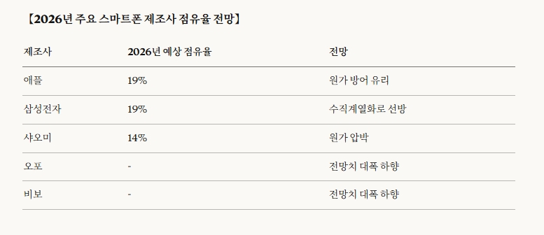 반면 삼성전자와 애플은 상대적으로 선방할 전망이다. 카운터포인트에 따르면 삼성전자의 2026년 스마트폰 시장 점유율은 19%로 애플과 공동 1위를 유지할 것으로 예상된다. 삼성전자의 출하량 성장률은 -2.1%로 시장 평균 수준을 유지하며, 아너(-3.4%) 등 중국 경쟁사의 하락 폭보다 양호한 수치다.
