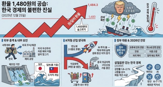 2026년 한국 경제는 1.8~2.1%의 완만한 성장이 예상되지만, 그 길은 살얼음판이다. 전문가들은 환율이 당장 1300원대로 내려가기는 어렵다고 본다. 트럼프 2기 행정부의 관세 폭탄이 언제 터질지 모르기 때문이다. 관세가 현실화되면 수출이 줄고, 이는 다시 성장률 저하와 환율 상승 압력으로 이어진다. 즉, 고환율은 일시적 현상이 아니라 '상수'가 될 가능성이 높다.