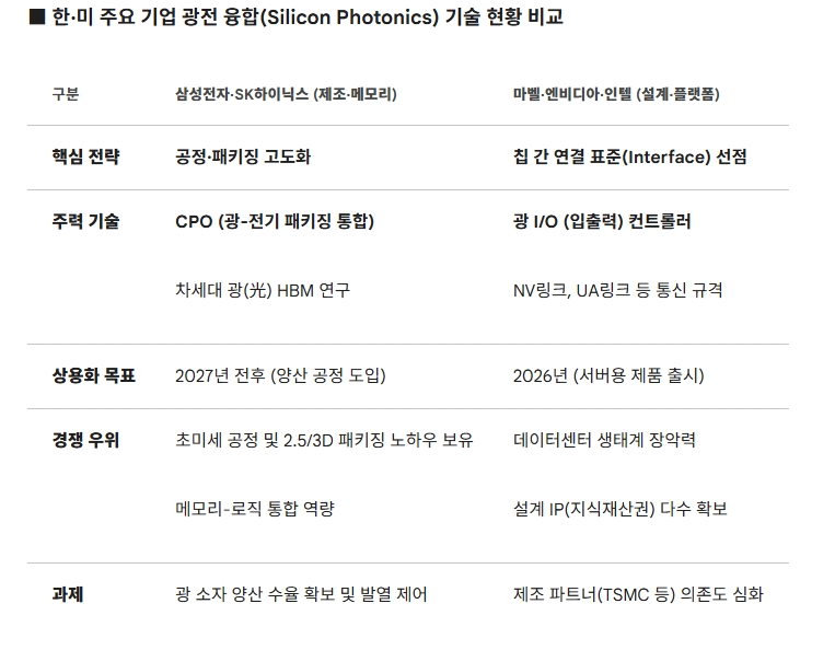 SK하이닉스 역시 메모리 대역폭의 물리적 한계를 넘기 위해 차세대 HBM(고대역폭메모리)에 광 인터커넥트 기술을 접목하는 방안을 모색 중이다. 다만 마벨이나 엔비디아 등 미국 빅테크들이 설계와 표준화 주도권을 쥐고 앞서가는 형국이라, 국내 기업들은 독자 기술 개발과 동시에 글로벌 생태계와의 전략적 협업이 시급하다는 지적이다.