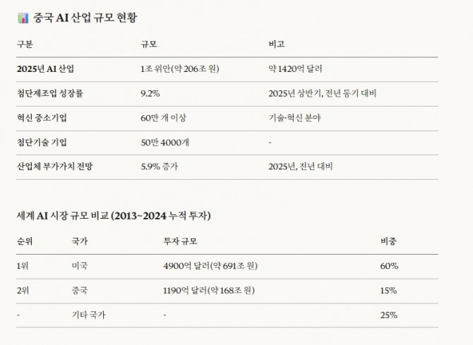 업계에서는 중국 AI 산업이 세계 2위 규모로 미국을 빠르게 추격하고 있다고 분석한다. 2013년부터 2024년까지 세계 AI 기업 투자 유치 건수에서 미국이 1위, 중국이 2위를 차지했으며, 두 나라가 전체 투자의 약 70%를 차지했다. 누적 투자 규모에서 미국이 4900억 달러(약 708조 원)로 세계의 60%를 차지하고, 중국이 1190억 달러(약 171조 원)로 뒤를 잇고 있다.