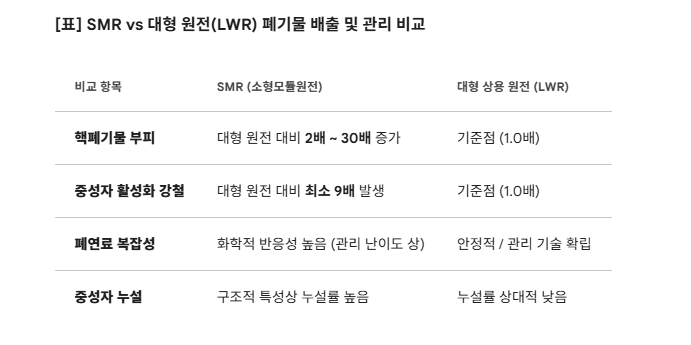 지난 2022년 발표된 한 연구 보고서에 따르면, SMR은 화학 반응성 연료와 냉각재 특성 탓에 기존 대형 원전보다 핵폐기물을 최소 2배에서 최대 30배까지 더 배출할 수 있는 것으로 나타났다. 이는 ‘더 깨끗한 에너지’라는 SMR의 핵심 마케팅 포인트와 정면으로 배치된다.