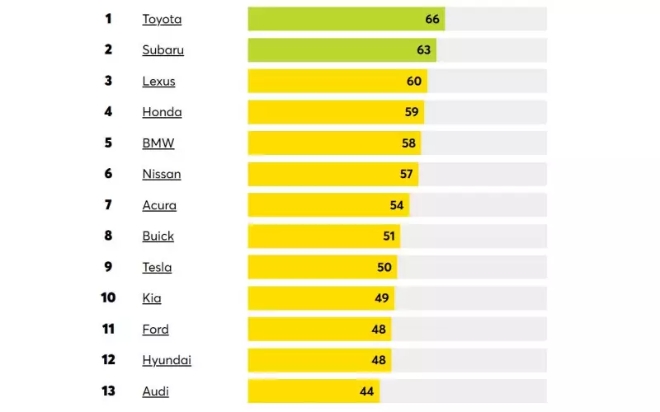 이어 닛산과 아큐라가 각각 57점으로 공동 6·7위, 뷰익이 51점으로 8위, 테슬라가 50점으로 9위, 기아가 49점으로 10위를 차지했다. 이 가운데 미국 브랜드는 뷰익과 테슬라 두 곳뿐이었다.