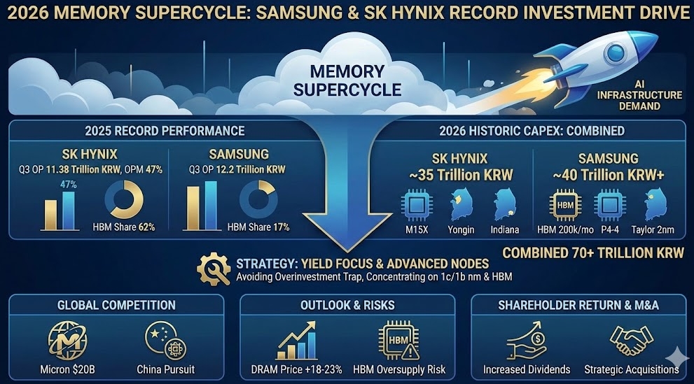 한편 양사는 이번 사이클에서 공격적 투자와 함께 신중한 전략도 병행하고 있다. 그 이유는 과거의 뼈아픈 교훈 때문이다. 2017~2018년, 2021~2022년 두 차례 메모리 슈퍼사이클을 경험한 양사는 '호황기 과잉투자의 함정'을 잘 알고 있다. 2018년 삼성전자가 영업이익 58조8900억 원, SK하이닉스가 20조8438억 원으로 사상 최대 실적을 기록한 직후, 2019년 불황기에 D램 가격이 47% 폭락하는 혹독한 대가를 치렀다. 2021~2022년 호황기에도 과잉 생산이 2023년 양사 모두 적자 전환으로 이어졌다.