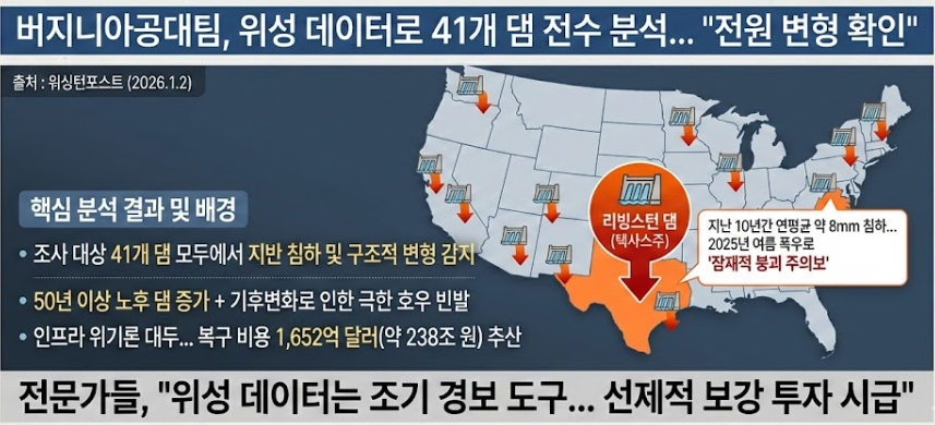워싱턴포스트(WP)는 2일 버지니아공대 연구팀의 분석을 인용해 미국 전역의 노후 댐들이 지반 침하로 붕괴 위험에 노출됐다고 보도했다. 이번 분석은 육안검사가 아닌, 인공위성을 활용한 정밀 진단이라는 점에서 인프라 안전 관리에 새로운 전환점이 될 전망이다.
