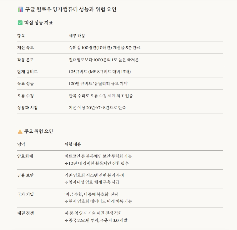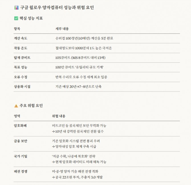 윌로우는 105큐비트를 탑재했다. 마이크로소프트 양자 프로젝트가 8큐비트를 사용하는 것과 비교된다. 전 세계 경쟁은 오류 없이 양자화학과 신약 설계를 수행할 '유틸리티 규모 기계'를 만들기 위해 100만 큐비트에 도달하는 데 집중돼 있다.