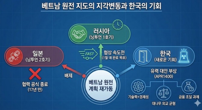일본의 탈락과 베트남의 '첨단 기술 파트너' 모집 선언은 한국에 호재로 작용할 전망이다. 에너지 업계와 전문가들은 베트남이 요구하는 '첨단 기술'과 '경제성'을 모두 충족하는 유력 후보로 한국을 꼽는다.