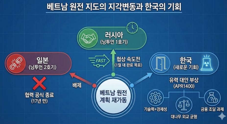 반면 러시아가 참여하는 닝투언 1호기 사업은 급물살을 타고 있다. 찐 총리는 국영 전력공사(EVN)에 "러시아 측과의 투자 협상을 이달 안으로 완료하라"고 못 박았다. 이는 예비 타당성 조사를 조기에 마치고 본사업 궤도에 올리겠다는 정부의 강력한 의지를 반영한다. 베트남 정부는 원전 건설을 국가 중요 프로젝트로 격상하고, 관련 절차를 획기적으로 단축할 특별법 제정까지 검토하고 있다.