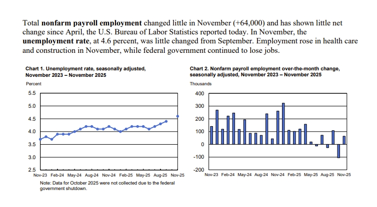 이 고용보고서에 따르면 신규일자리 증가는 5만명이다. 실업률은 4.4%로 나타났다. 실업률 4.4%는 종전보다 더 좋아진 것이다. 실업률 4.4%로 볼때 연준의 금링니한느 더 어려워졌다. ㅇ녀방 정부의 셧다운으로 발표가 지연됐던 고용 보고서가 마침내 발표됐다. 이번 고용 보고서 발표는 추가 금리 인하 여부를 점칠 수 있는 중요한 핵심적 경제 데이터다. 트럼프 대통령이 대규모 관세 폭탄을 퍼붓자, 기업들은 가격을 올리는 대신 직원을 감원하는 형태로 대응하고 있다. 그바람에 고용보고서가 급속 악화되고 있다. 미국 노동부는 지난해 12월 미국의 비농업 일자리가 전월 대비 5만명 증가했다고 밝혔다.일자리 증가 폭은 다우존스가 집계한 전망치(7만3천명)를 밑돌았다.작년 10∼11월 일자리 증감 폭이 총 7만6천명 하향 조정됐다. 작년 10월 증감 폭이 10만5천명 감소에서 17만3천명 감소로, 작년 11월 증가폭은 6만4천명 증가에서 5만6천명 증가로 각각 하향 조정됐다.12월실업률은 4.4%로 전월 대비 하락했다. 작년 11월 실업률은 종전 4.6%에서 4.5%로 0.1%포인트 하향 조정됐다.