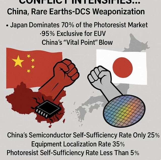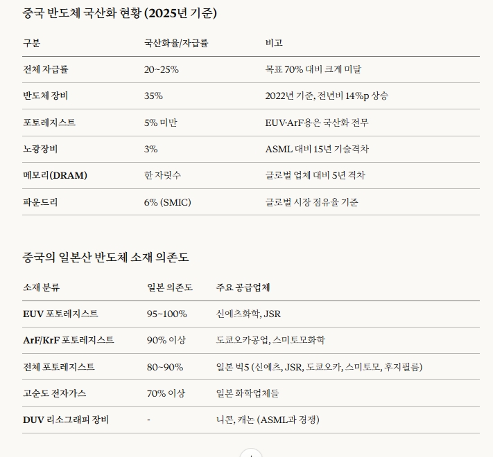 포토레지스트는 중국이 가장 민감하게 의존하는 분야다. 일본의 수출 통제가 강화되면 첨단 공정과 성숙 공정 모두에 영향을 미칠 수 있다. 지난해 상반기 중국의 포토레지스트 수입량 가운데 50% 이상이 일본산이었으며, 일본은 7나노미터(nm)에서 28nm 공정에 사용되는 ArF 포토레지스트 글로벌 시장의 70% 이상을 장악하고 있다.