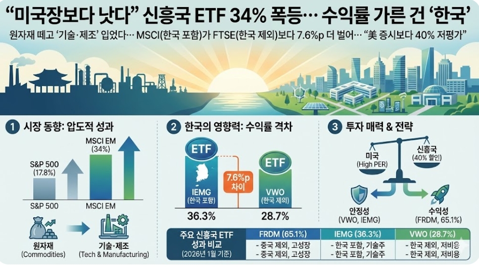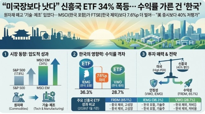 미국 증시 그늘에 가려져 있던 신흥국 증시가 긴 잠에서 깨어났다. 지난해 신흥국 주식시장은 기술주와 제조업 중심의 체질 개선에 힘입어 미국 S&P500 지수 상승률을 두 배 가까이 앞질렀다. 특히 한국 증시를 포함하느냐에 따라 펀드 수익률이 크게 엇갈리며 '한국 기술주'의 위상이 재확인됐다. 이미지=제미나이3