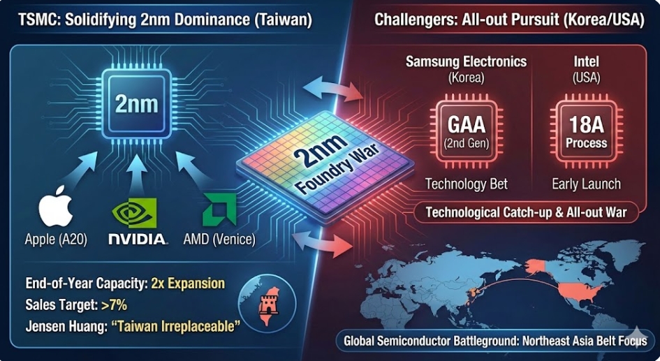 글로벌 파운드리(반도체 위탁생산) 패권 다툼이 3나노를 넘어 ‘2나노미터(nm·10억분의 1m)’ 초미세 공정에서 전면전으로 치닫고 있다. 세계 1위 대만 TSMC는 애플과 엔비디아 등 핵심 고객사 물량을 선점하며 2나노 양산 체제 굳히기에 들어갔다. 젠슨 황 엔비디아 최고경영자(CEO) 역시 대만 반도체 생태계의 대체 불가능성을 강조하며 TSMC에 힘을 실어줬다. 이에 맞서 삼성전자와 인텔은 차세대 기술과 조기 양산 카드를 꺼내 들며 시장 판도를 뒤집으려 총력전에 나섰다.