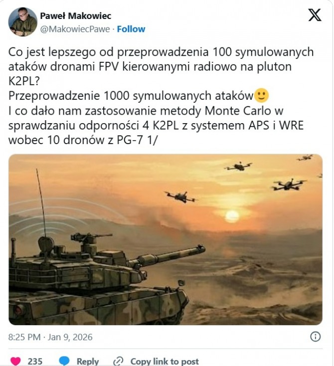 연구진은 몬테카를로(Monte Carlo) 기법을 활용해 K2PL 전차 4대로 구성된 1개 소대가 PG-7 대전차 고폭탄을 장착한 FPV 드론 10대의 공격을 받는 상황을 1,000회 반복 가정했다. 총 1만 대 드론이 투입된 셈이다.
