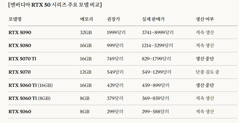 이는 엔비디아가 SKU 라인업을 간소화해 RTX 5060 Ti 8GB, RTX 5080, RTX 5090 D v2, RTX 5090에 집중할 의도로 해석된다. 다른 모델 공급은 크게 줄어들 전망이다.
