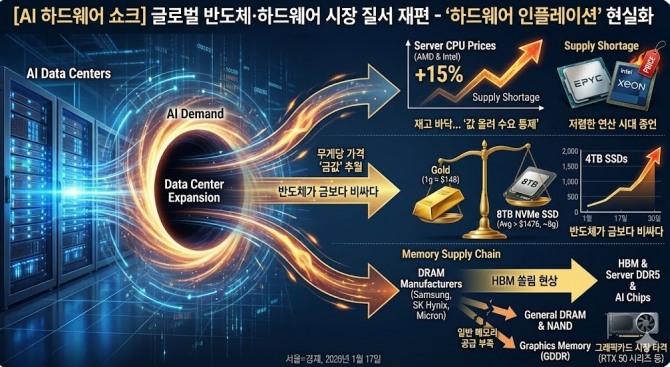 인공지능(AI)이라는 거대한 블랙홀이 글로벌 반도체와 하드웨어 시장의 가격 질서를 송두리째 흔들고 있다. AI 데이터센터 구축 열풍이 연산 장치(CPU)와 저장 장치(SSD)의 재고를 싹쓸이하면서, 주요 부품 가격이 동시다발적으로 치솟는 하드웨어 인플레이션(Hardware Inflation)’이 현실화했다.