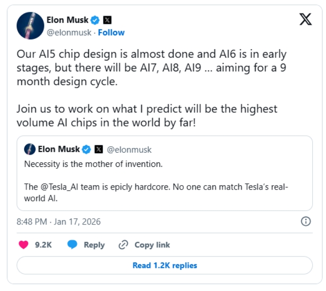 17일(이하 현지시각) 블룸버그통신에 따르면 머스크는 이날 자신의 소셜미디어 X에 올린 글에서 “AI5 칩 설계가 거의 끝났고 AI6 개발을 시작했다”며 “앞으로는 칩 설계 주기를 약 9개월로 단축하는 것을 목표로 하고 있다”고 밝혔다.