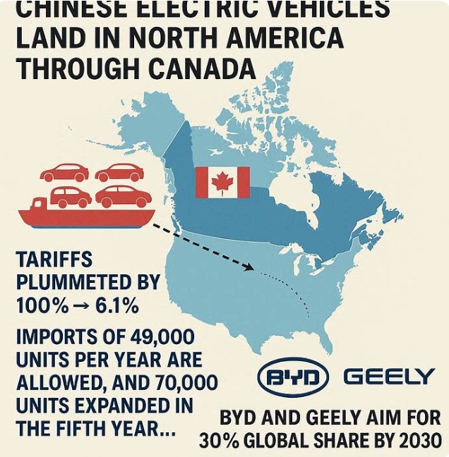 중국은 2023년 캐나다에 전기차 4만1678대를 수출했다. SNE리서치에 따르면 2025년 1~3월 비야디(BYD)는 87만5000대를 판매하며 글로벌 전기차 시장 점유율 20.2%로 압도적 1위를 차지했다. 지리(Geely) 그룹은 45만대를 판매하며 79.7% 성장률을 보였다.