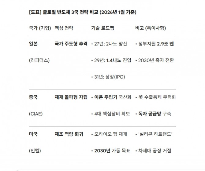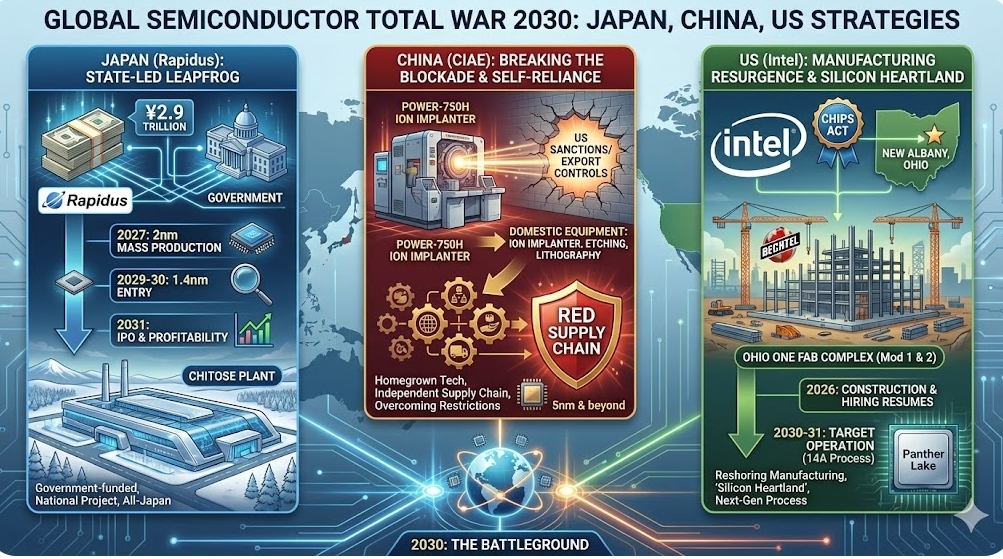 미·일·중 3국의 움직임은 공통적으로 2030년을 정조준하고 있다. 일본 라피더스의 흑자 전환과 1.4나노 양산, 인텔 오하이오 팹의 본격 가동, 중국의 장비 자립화 완성 시점이 모두 이 시기로 수렴한다.