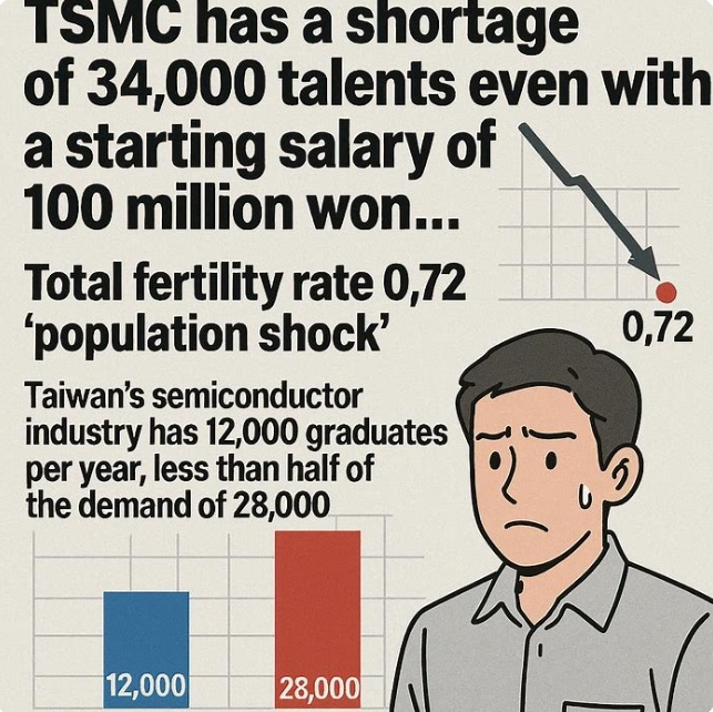 대만 인재난의 근본 원인은 심각한 저출산이다. 2025년 대만 합계 출산율은 0.72로 한국 0.75마저 제치고 세계 최저를 기록했다. 연간 출생아는 2014년 21만 명에서 2025년 10만8000명으로 급감했다.