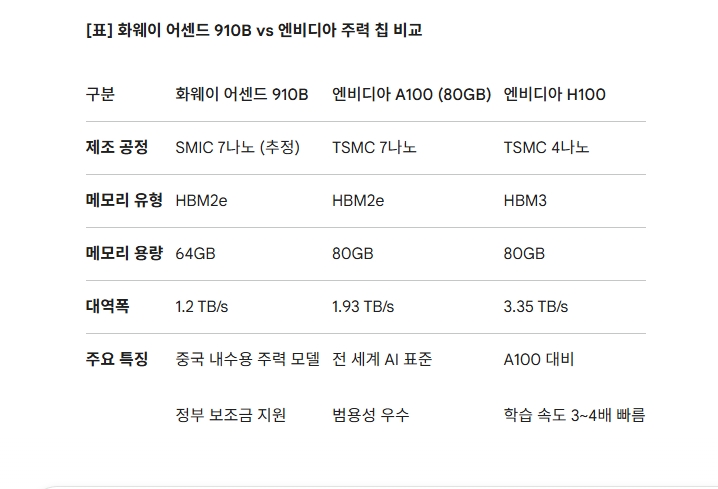 중국 정부가 빗장을 건 자신감의 배경에는 화웨이의 AI 가속기 '어센드(Ascend) 910B'가 있다. 업계 분석을 종합하면, 어센드 910B의 연산 성능(FP16 기준)은 엔비디아의 이전 주력 모델인 'A100'의 80~90% 수준까지 올라왔다. 텍스트 기반의 일반적인 AI 추론 작업에는 무리가 없다는 게 베이징의 계산이다.