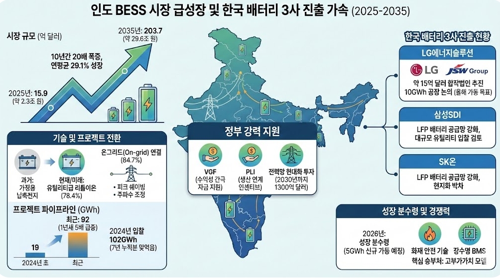 거대하게 열리는 인도 BESS 시장은 최근 전기차 수요 정체로 돌파구를 찾는 한국 배터리 기업들에 전략적 요충지가 되고 있다.