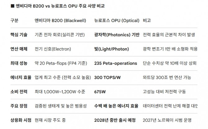 엔비디아 B200과 뉴로포스 OPU 성능 비교. 도표=글로벌이코노믹/제미나이3이미지 확대보기