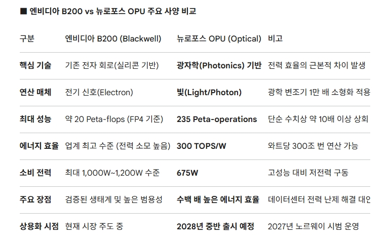 엔비디아 B200과 뉴로포스 OPU 성능 비교. 도표=글로벌이코노믹/제미나이3