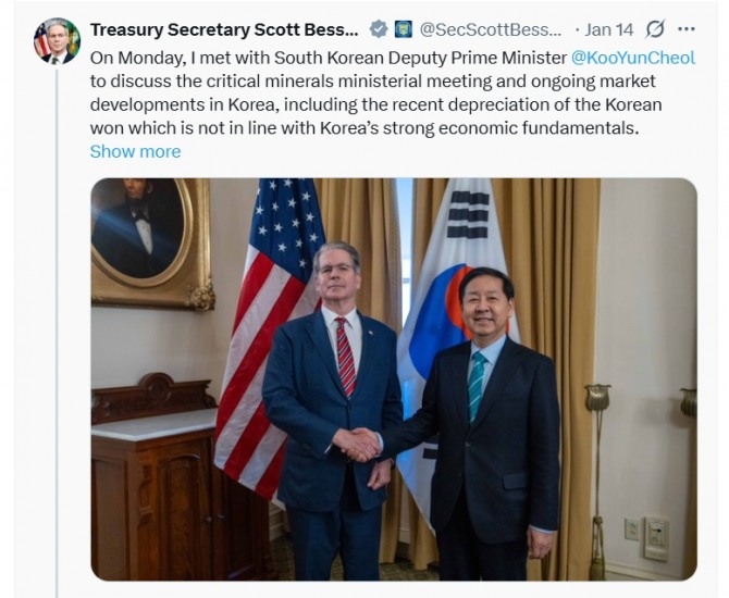 외환 분석업체 스펙트라 마켓의 브렌트 도넬리 창립자는 로이터에 "베센트 장관의 원화 관련 발언을 고려할 때, 미국과 일부 아시아 국가들이 엔, 원, 대만달러 가치를 안정화하거나 강화하기로 합의했다고 믿는 것은 전혀 터무니없는 일이 아니다"라고 말했다.