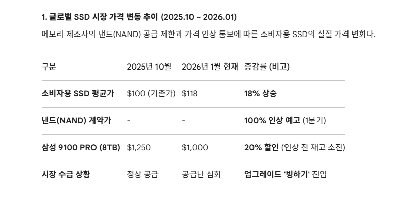 실제 시장의 가격 지표는 이미 요동치고 있다. PC 부품 가격 비교 사이트 PC파트피커(PCPartPicker) 조사 결과, 지난해 10월 이후 SSD 평균 가격은 이미 18% 상승했다. 업계에서는 이번 낸드 계약가 인상분이 소매 시장에 본격 반영되면 가격 상승 폭이 걷잡을 수 없이 커질 것으로 보고 있다. 현재 아마존 등에서 삼성 9100 PRO 8TB 모델 등이 할인 판매 중이나, 이는 본격적인 가격 폭등을 앞둔 마지막 재고 소진이라는 분석이 지배적이다.