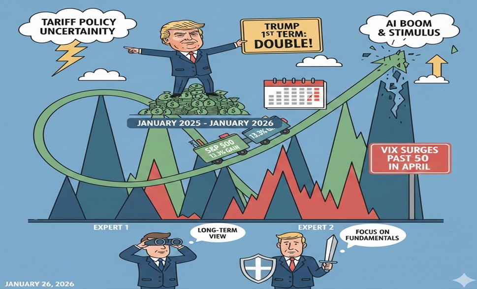 지난 1년 미국 증시는 인공지능(AI) 열풍이라는 강력한 동력이 있었음에도 행정부의 관세 정책을 둘러싼 혼선 탓에 극심한 변동성을 나타냈다. 특히 지난해 4월에는 트럼프 대통령이 전 세계를 대상으로 한 보편 관세 부과를 경고하면서 투자 심리가 급격히 위축됐고, 증시는 약세장 진입 직전까지 추락했다.