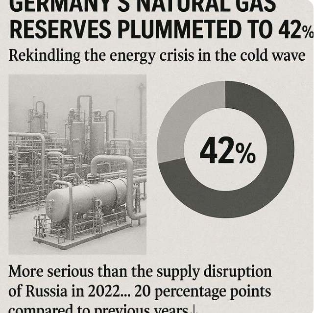 독일 가스·수소 경제 연맹의 팀 켈러 회장은 지난 26일 아우크스부르크 알게마이네 인터뷰에서 "가스 저장시설 비축량이 42%까지 떨어져 2022년 위기 당시보다 낮은 이례적 수준"이라고 밝혔다. 이는 2017년에서 2021년 동기 평균 비축량보다 20%포인트 이상 낮은 수치다.