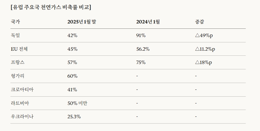 프랑스는 평균 75% 대비 57% 수준에 머물고 있다. EU는 2022년 에너지 위기 이후 회원국들에 11월 1일까지 저장시설을 90% 채우도록 의무화했으나 2025년에는 다수 회원국이 목표 달성에 실패했다.